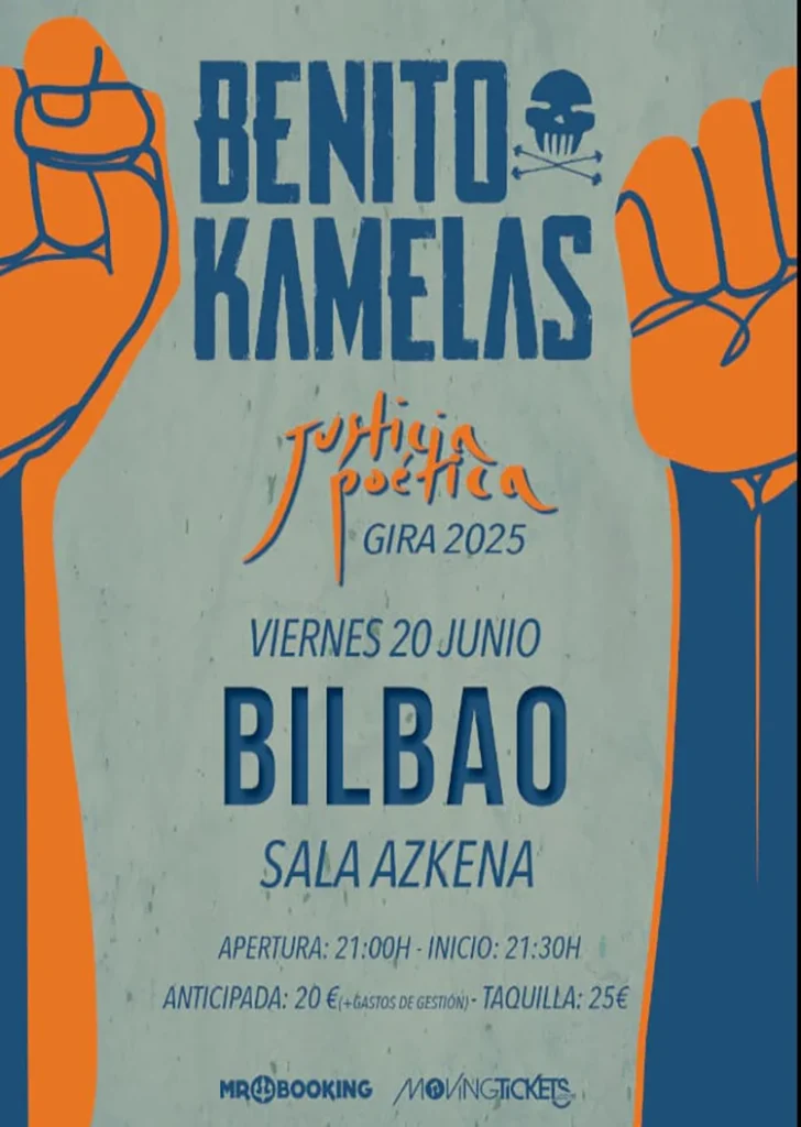 Los valencianos Benito Kamelas presentarán este viernes su nuevo disco “Justicia Poética” en la sala Azkena (Bilbao). La banda sigue demostrando que su música es un grito de libertad y sentimiento, conquistando a nuevas generaciones sin olvidar a sus fieles seguidores, con canciones con mucha capacidad de enganche y un sentimiento siempre sincero, rindiendo homenaje a quienes desafían lo establecido y se preocupan por lo que es justo, por la igualdad y el respeto. 21:30 horas. Anticipada: 20 euros más gastos en https://movingtickets.com. En taquilla: 25 euros