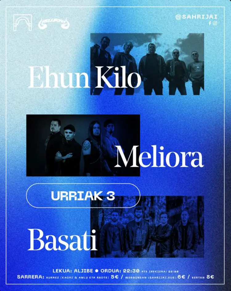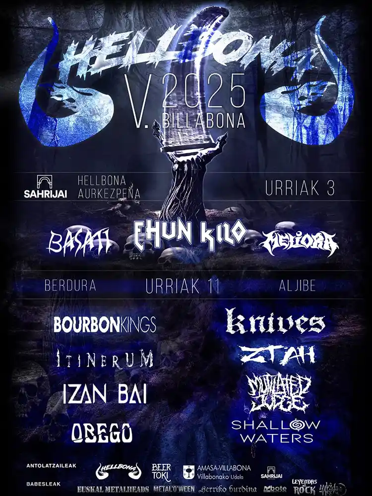 El 3 de octubre se llevará a cabo la fiesta de presentación del Hellbona Festival 2025 en el Aljibe (Billabona, Gipuzkoa), con las actuaciones de Ehun Kilo, Meliora y Basati. 22:30 horas. Anticipada: 5 euros en Kaori, Amlu y RBOTE Taberna. En internet al precio de 6 euros en https://sahrijai.eus. En taquilla: 8 euros.