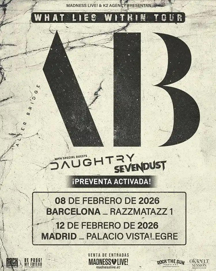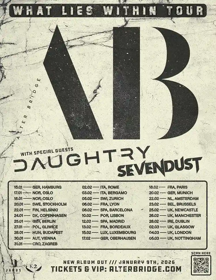 Los norteamericanos Alter Bridge lanzarán su octavo disco de estudio, de título homónimo, el 9 de enero a traves del sello Napalm Records. Un álbum donde han conservado toda su esencia pero con un salto muy significativo en muchos aspectos. El álbum ha sido producido por Michael “Elvis” Baskette en California y Florida. Tras su lanzamiento la banda se embacará en una gira “What Lies Within”, por Europa y Reino Unido, acompañados de Daughtry y Sevendust. Las fechas en nuestro país son las siguientes: