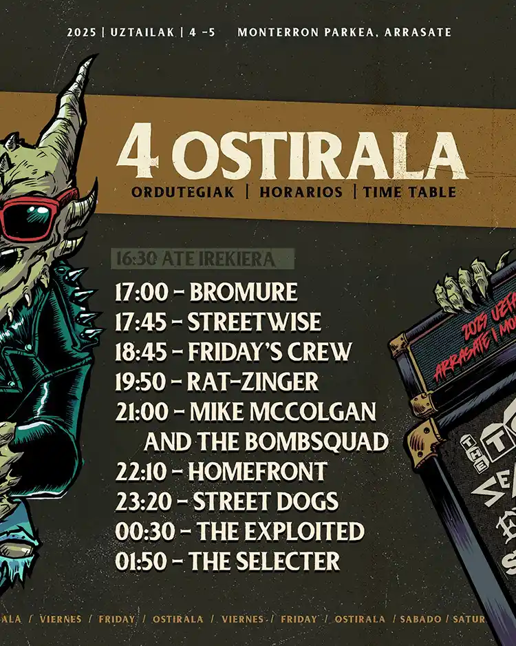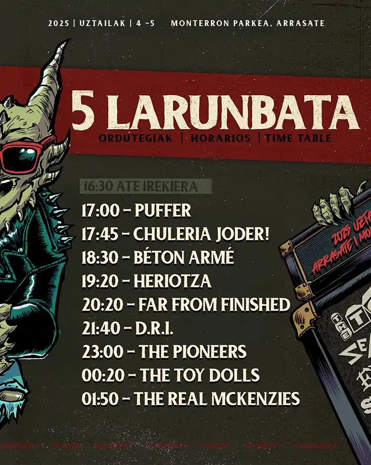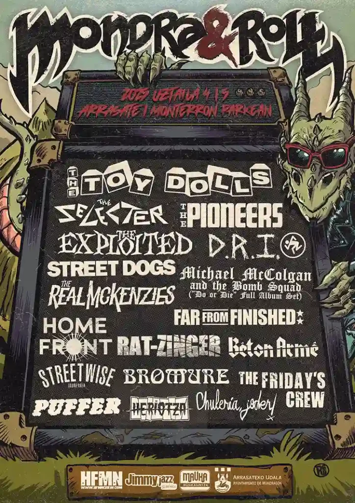 Ya se conocen los horarios de las actuaciones de la próxima edición del Mondra & Roll, que se llevará a cabo los días 4 y 5 de julio de 2025 en el Parque Monterrón (Arrasate, Gipuzkoa). Abonos a la venta la precio de 85 euros más gastos en https://www.musikaze.net