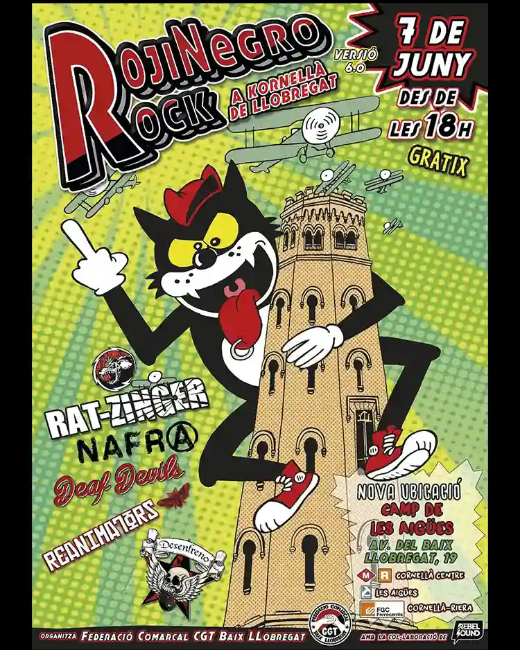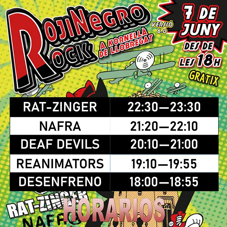 Ya se encuentran disponibles los horarios de la sexta edición del Rojinegro Rock, que se llevará a cabo este sábado en Cornellà de Llobregat (Barcelona). Las bandas que participarán son: Rat-Zinger, Nafra, Deaf Devils, Reanimators y Desenfreno. Entrada libre.