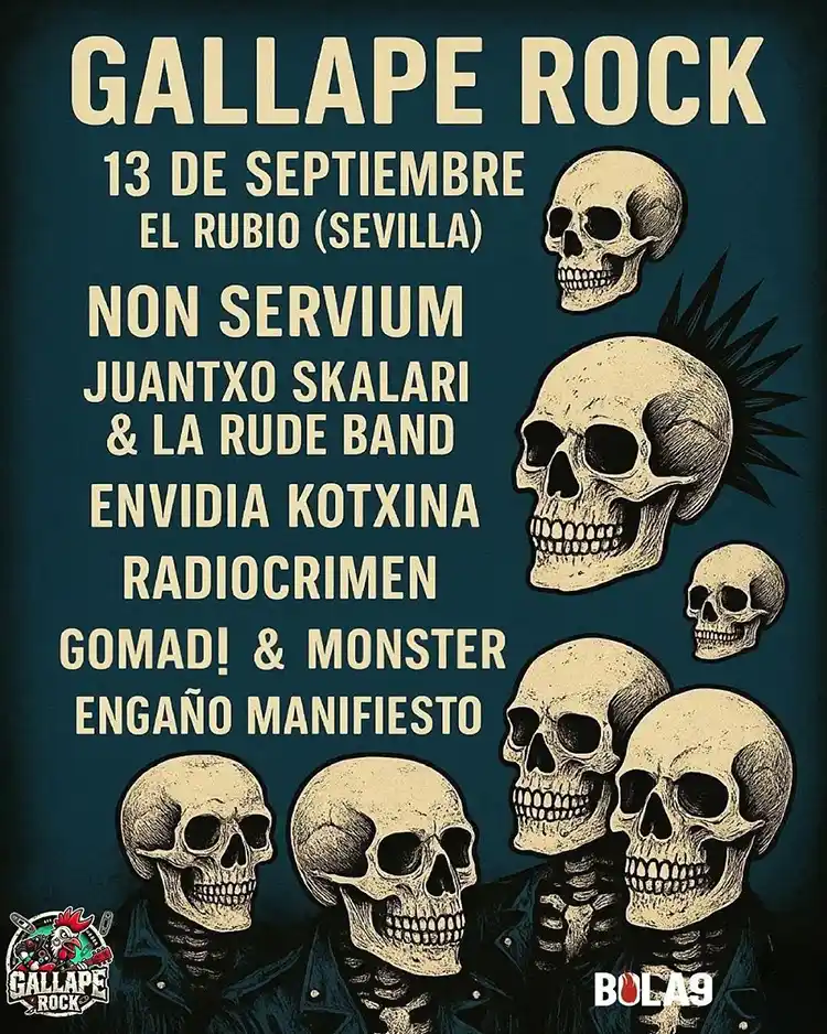 A escasos días de la celebración de la decimocuarta edición del Gallape Rock, ya se han hecho oficial los horarios de las actuaciones de las bandas que participarán en la misma, Non Servium, Juantxo Skalari & La Rude Band, Envidia Kotxina, Radiocrimen, Gomad! & Monster y Engaño Manifiesto. Recordaros que se llevará a cabo el sábado en El Rubio (Sevilla). Aforo limitado. Acampada gratuita en la pisicina municipal. Entradas a la venta en https://www.wegow.com