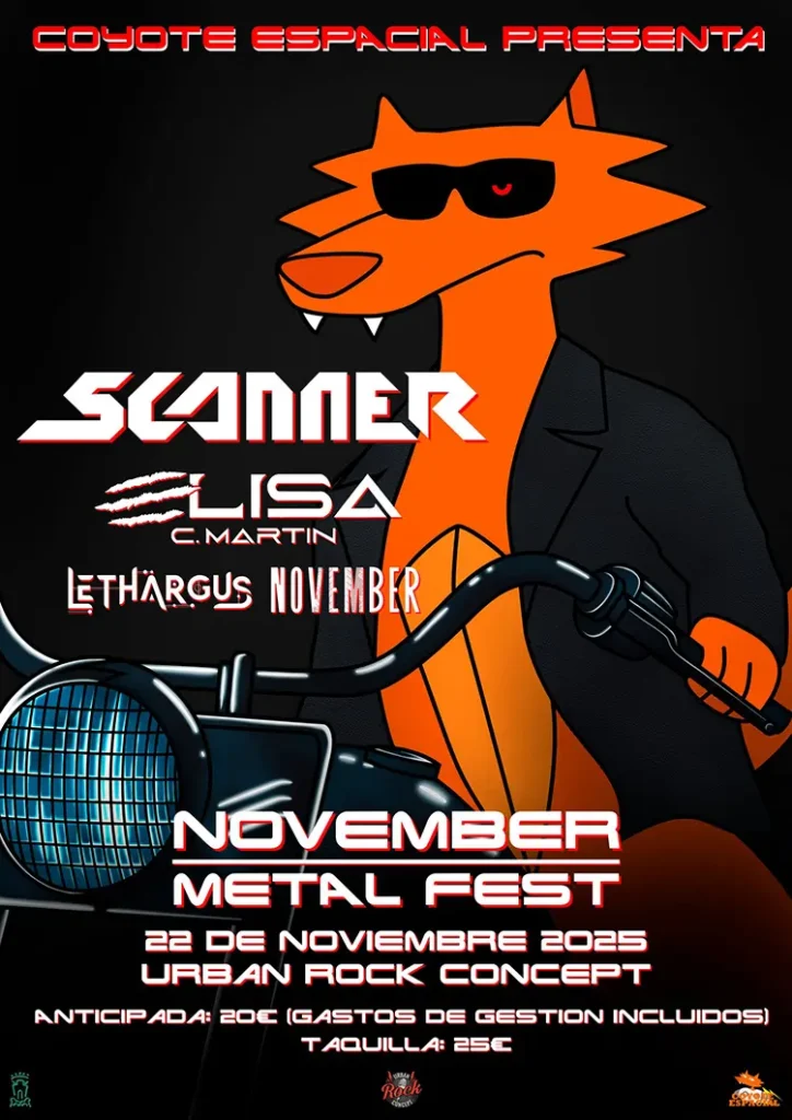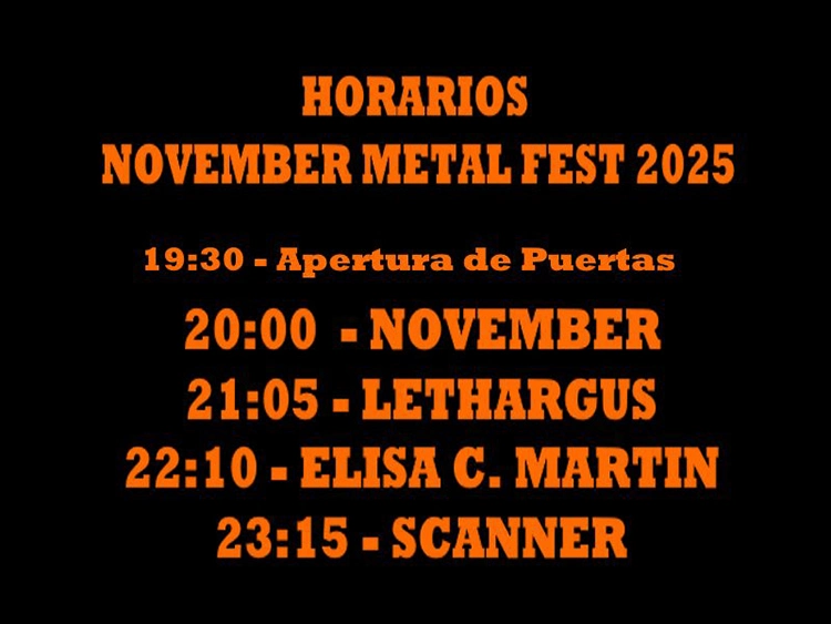 La sala Urban Rock Concept (Gasteiz) acogerá este sábado la sexta edición del November Metal Fest. Un festival de Heavy Metal organizado por músicos, dónde se trata con respeto a todos los grupos que se contratan, donde todo el mundo cobra (nadie acude por promoción). Las bandas participantes en esta nueva edición son: Scanner, Elisa C. Martin, Lethargus y November. Os facilitamos los horarios de las actuaciones. Anticipada: 20 euros más gastos en https://woutick.com. En taquilla: 25 euros.