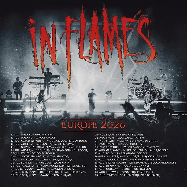 Los suecos In Flames llevará a cabo una gira europea por salas y festivales durante los meses de julio y agosto de 2026, teniendo tres paradas únicas en nuestro país, una de ellas en el Leyendas del Rock. Armados con su inconfundible mezcla de melodía, agresión y atmósfera, In Flames encabezarán una poderosa mezcla de conciertos en clubes, eventos al aire libre y festivales de primer nivel, ofreciendo un setlist que celebra su legado mientras avanzan hacia un nuevo territorio creativo. La gira se extiende desde mediados de julio hasta finales de agosto, llevando a la banda a más de veinte ciudades y a muchos de los festivales más icónicos del continente