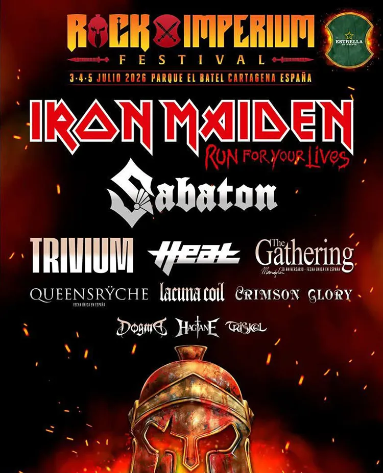 La quinta edición del Rock Imperium Festival promete ser la más grande de su historia. Iron Maiden, la banda de heavy metal más grande de todos los tiempos, se erige como el gran cabeza de cartel de la jornada del sábado 4 de julio, en una edición que contará también con los suecos Sabaton encabezando la jornada del domingo, con la potencia de Trivium , el reencuentro de The Gathering, la presencia escénica de H.E.A.T , la elegancia de Queensrÿche , el gothic metal de Lacuna Coil, el virtuosismo de Crimson Glory y muchos más. Se llevará a cabo del 3 al 5 de julio de 2026 en el Parque El Batel (Catagena).