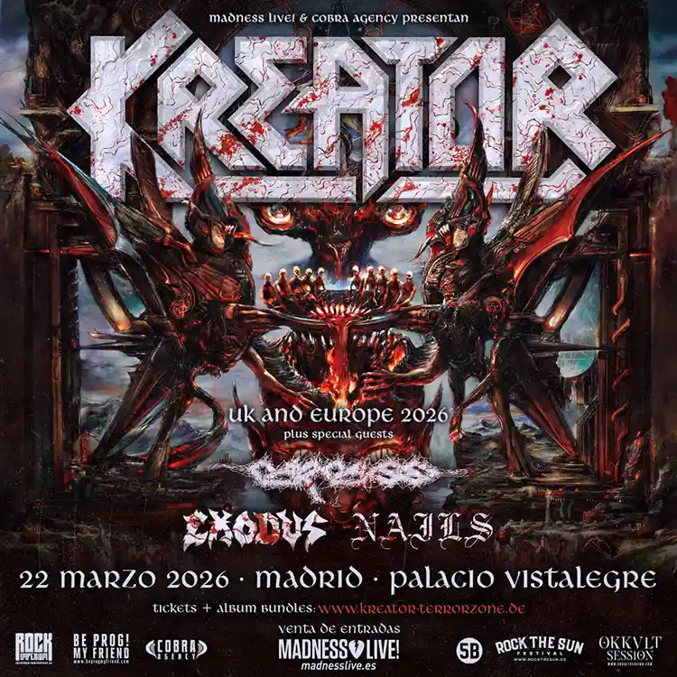 Kreator, los indiscutibles amos del thrash europeo, lideran esta tempestad de riffs y furia. Con más de cuarenta años de carrera, himnos que han definido generaciones como “Violent Revolution”, “Pleasure to Kill” o “Enemy of God”, y un directo que arde como pocas bandas en el planeta, Mille Petrozza y los suyos prometen un asalto total que no dejará piedra sobre piedra.