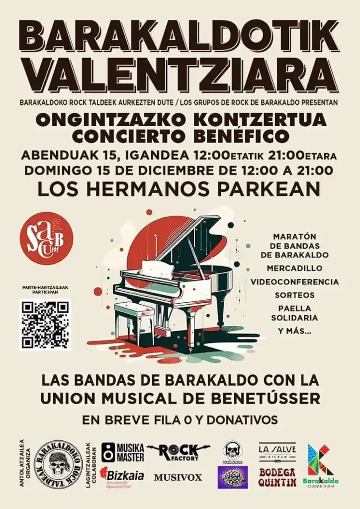 Las bandas de Barakaldo (Bizkaia) con el apoyo del ayuntamiento de la localidad, la Diputación Foral de Bizkaia, La Salve, Bodega Quintín, Musika Master, Rock Factory, Musivox, Rotulaciones Rotor, Bar Sugoi y Malamuerte Musika Elkartea organizan este domingo un maratón musical “Barakaldotik Valentziara”, en una carpa situada en el parque de Los Hermanos (Barakaldo, Bizkaia), para recaudar fondos a través de donaciones, una paella solidaria, un mercadillo, para la agrupación musical La Unión Musical Benetússer, cuyas instalaciones y todo el material fue dañado por la DANA. Algunas de las formaciones que actuarán son las siguientes: EnRockecidos, Room20, Nada Cool, Aupa Hi!, Laztana Laztana, Txapajo, Densidad 0, Acordes Prohibidos, Sabes Muy Bien, Izan Ezean, El Capitán Elefante, Elektrika, Tresonrock, Deskuadre, Leaven Slave, Los Men, Tío, Kruela, Old Glasses, Iván Rocker, Red Coffee, Even Mud, Overall, Lasai, Toni Metralla y Los Antibalas, Parabellum, Los Retumbes y Mary Rockings.