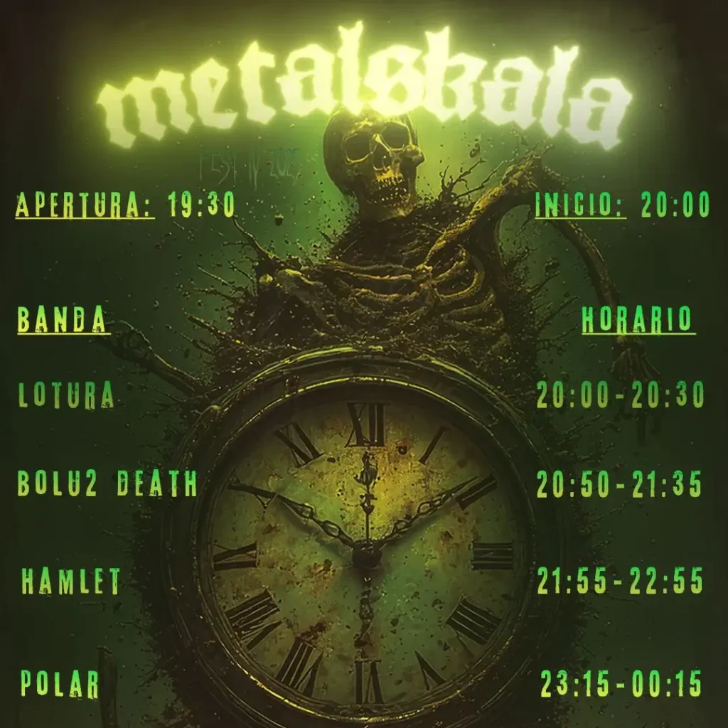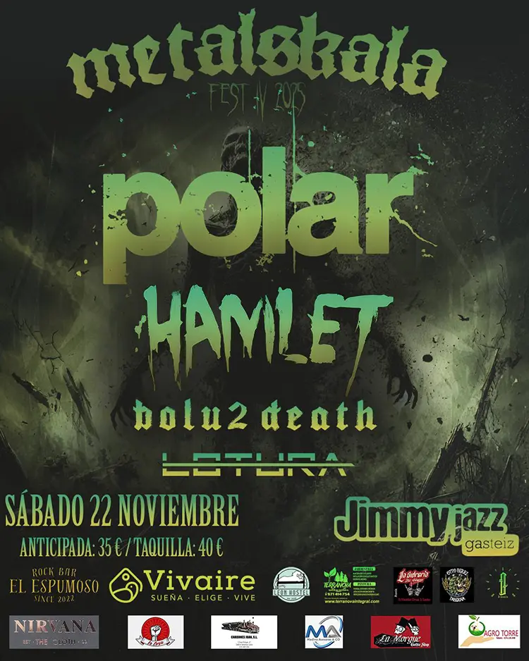 Los británicos Polar serán los cabezas de cartel de la cuarta edición del Metalskala Fest, que tendrá lugar este sábado en la sala Jimmy Jazz (Gasteiz). La banda presentará su nuevo álbum “Five Arrows”, un trabajo brutal cargado de riffs demoledores y letras que exploran la lucha, la resiliencia y el renacimiento en un mundo post-apocalíptico. El resto de bandas que actuarán son las siguientes: Hamlet, Bolu2Death y Lotura. Os facilitamos los horarios de las actuaciones. Entradas al precio de 36,82 euros (gastos incluidos) en https://entradium.com/es. En taquilla: 40 euros.
