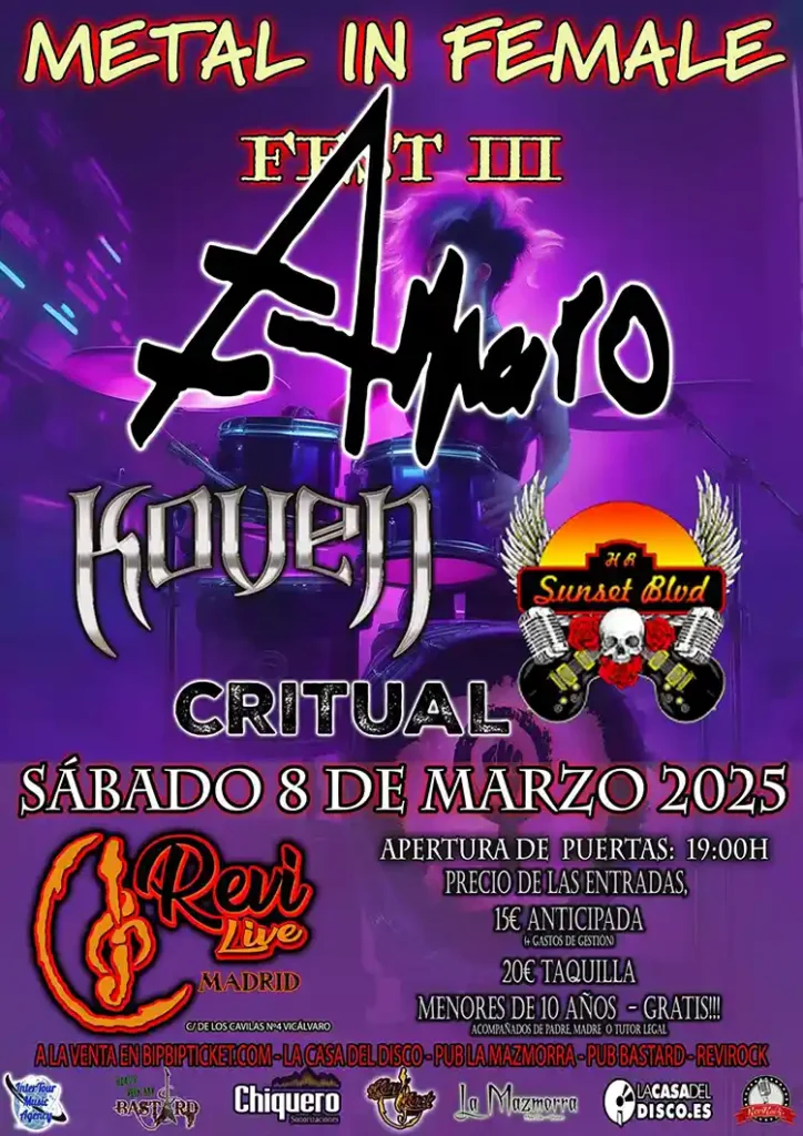 Amaro, KoveN, Sunset BLVD y Electric Flames compartirán escenario en la tercera edición del Metal In Female, que se celebrará el 8 de marzo en la sala Revi Live (Madrid). 19:00 horas. Anticipada: 15 euros, a la venta en La Casa del Disco, Pub La Mazmorra, Pub Bastard, ReviRock y https://bipbipticket.com En taquilla: 20 euros.