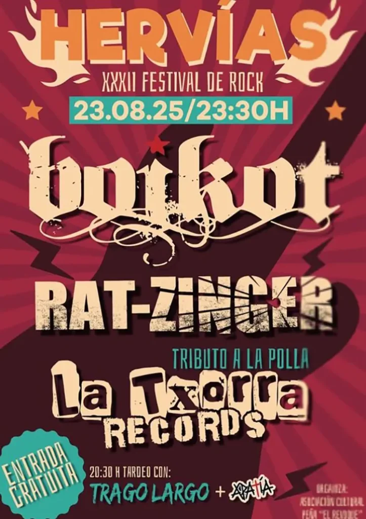 El 23 de agosto se celebrará una nueva edición del Hervias Rock en Hervías (La Rioja), organizada por la Asociación Cultural Peña El Revoque. Será la trigésimo segunda edición, en la cual actuarán Boikot, Rat-Zinger y La Txorra Records (tributo a La Polla) a la noche (23:30 horas). Desde las 20:30 horas habrá tardeo con Trago Largo y Apatía. Entrada gratuita