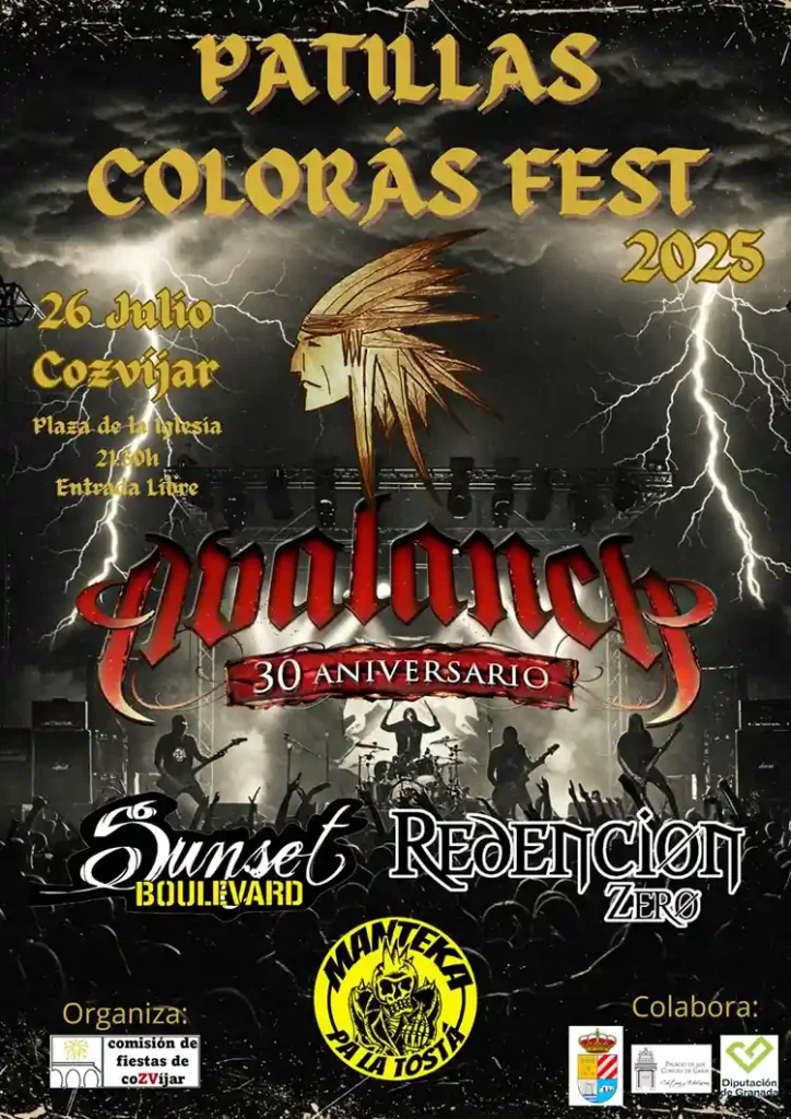 Los asturianos Avalanch encabezarán la próxima edición del Patillas Colorás Fest, que se llevará a cabo el 26 de julio en la Plaza de la Iglesia de Cozvíjar (Granada), con entrada libre. El resto de bandas que participarán son las siguientes: Sunset Boulevard, Redención Zero y Manteka pa la Tostá.