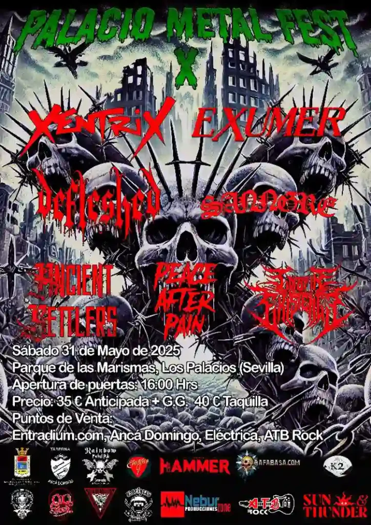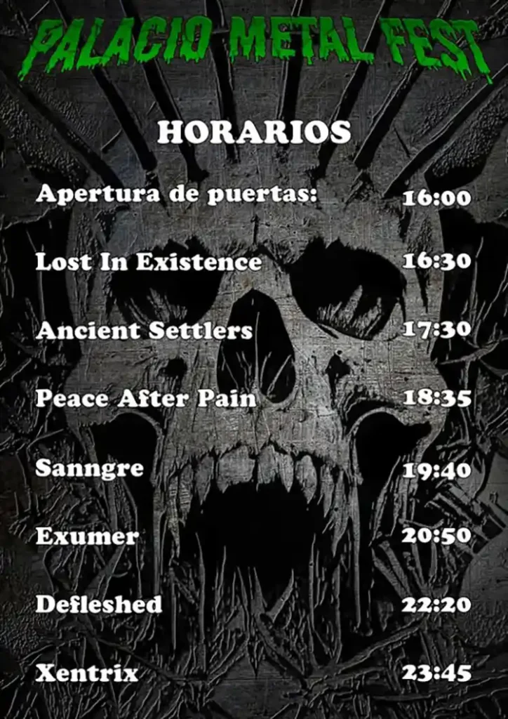 Ya están disponibles los horarios de las actuaciones de la décima edición del Palacio Metal Fest, que se celebrará el 31 de mayo en el Parque de las Marismas (Los Palacios, Sevilla). Lost In Existence, Xentrix, Exumer, Defleshed, Sanngre, Peace After Pain y Ancient Settlers son las formaciones que actuarán en esta nueva edición. Anticipada: 35 euros más gastos en Ancá Domingo, Eléctrica, ATB Rock y https://entradium.com