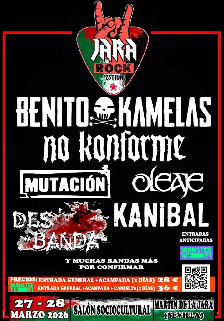 Los organizadores del Jara Rock Festival han dado a conocer parte del cartel de la quinta edición del festival, que se celebrará el 28 de marzo de 2026 en la localidad sevillana de Martín de la Jara. Las bandas confirmadas a día de hoy son las siguientes: Benito Kamelas, No Konforme, Mutación, Oleaje, Des Banda y Kanibal. Abonos a la venta en https://www.monsterticket.com