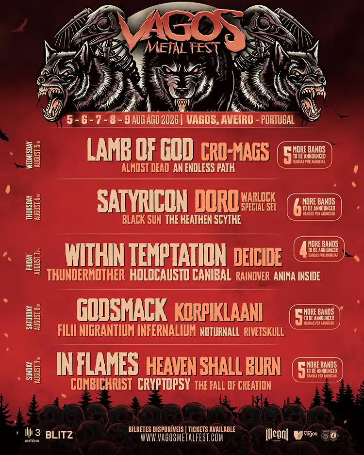La novena edición del Vagos Metal Fest se llevará a cabo los días 5, 6, 7, 8 y 9 de agosto de 2026 en el Parque Municipal de Quinta do Ega (Vagos, Portugal). Os damos a conocer las bandas que están confirmadas a día de hoy.