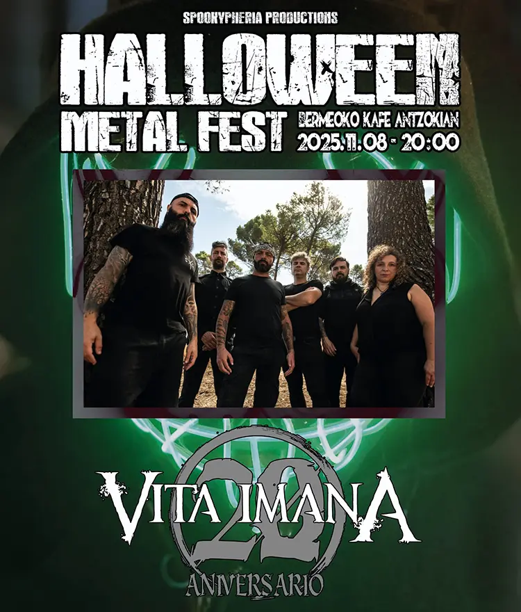 Vita Imana será uno de los grandes reclamos de la próxima edición del Halloween Metal Fest, que se llevará a cabo el 8 de noviembre en el Kafe Antzokia (Bermeo, Bizkaia). La banda se encuentra inmersa en una gira conmemorativa por sus 20 años de andadura musical, uno de los exponentes de metal del país tanto por estilo, como por intensidad en sus conciertos, que siguen trayendo muchas emociones, sentimientos y energía por gran parte de la península y fuera de ella.